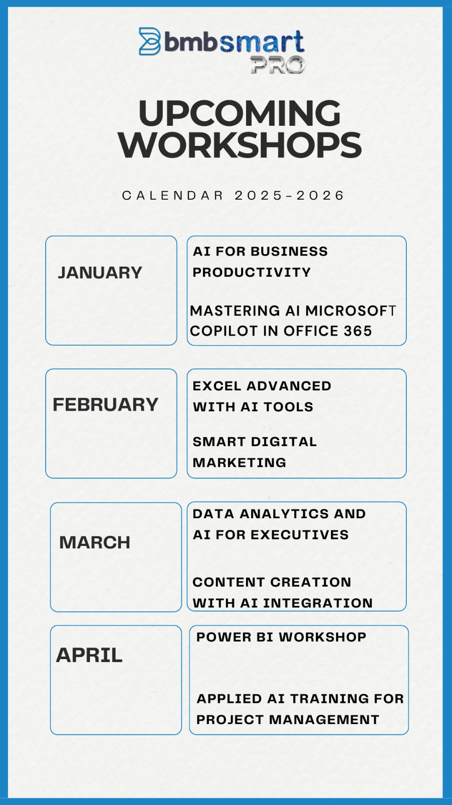 BMB Smart Pro provides hands-on training in the technologies driving the future of business. From AI to cybersecurity and beyond, we turn knowledge into practical workplace skills.